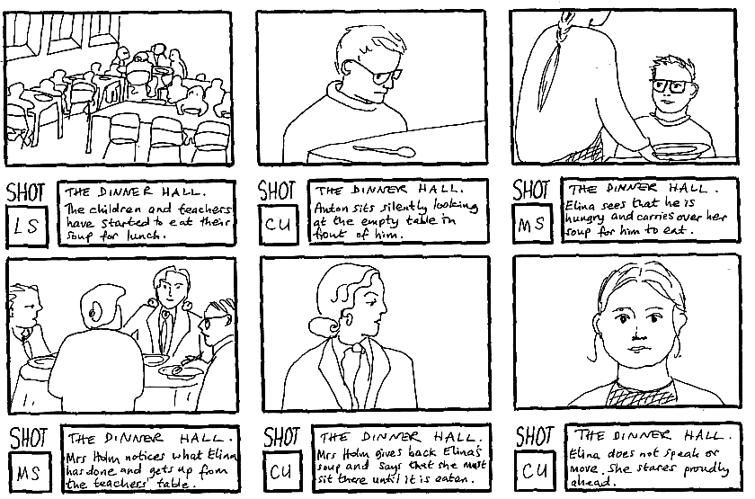 They don’t have to be beautifully drawn and detailed like a comic but they should provide information about camera angles, volumes, perspective and expressions – so no stick figures.